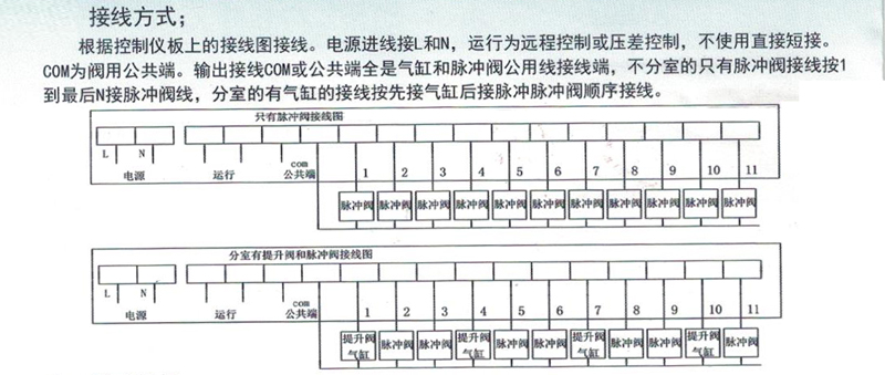 根據(jù)控制儀板上的接線圖接線。電源進線接L和N,運行為遠程控制或壓差控制,不使用直接短接。COM為閥用公共端。輸出接線COM或公共端全是氣缸和脈沖閥公用線接線端,不分室的只有脈沖閥接線按1到后面N接脈沖閥線,分室的有氣缸的接線按先接氣缸后接脈沖脈沖閥順序接線。